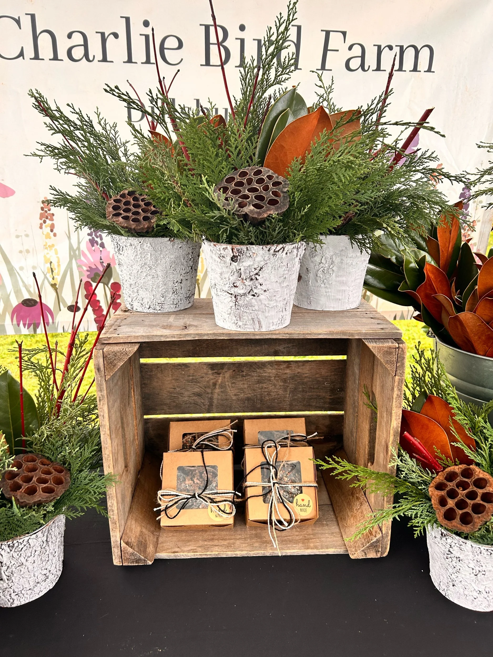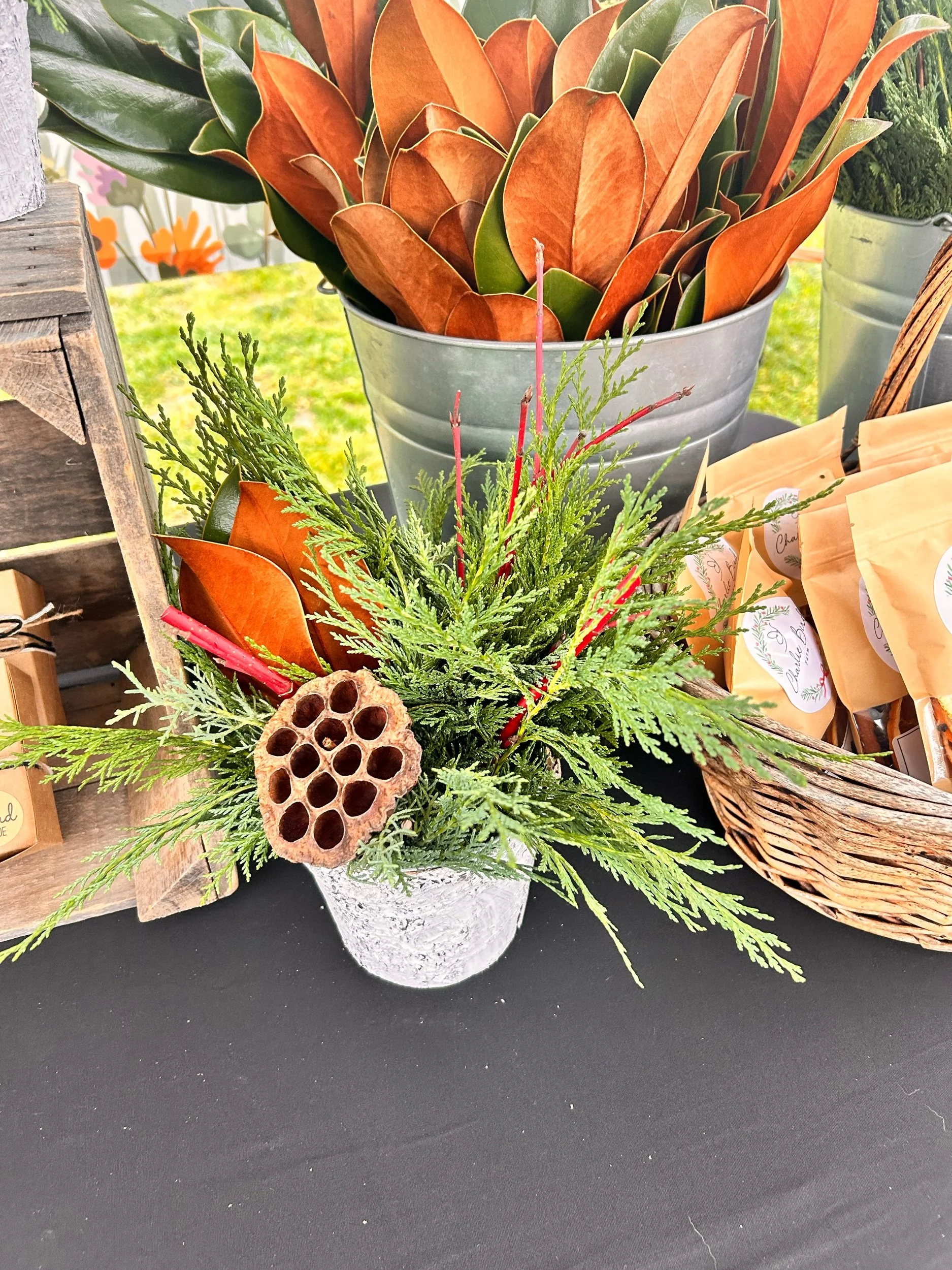 Our small tabletop pots are made from fresh greens and seasonal accents nestled in a birch pot. Pot measures 5” by 4.25”. Water or mist regularly to prolong vase life. Pickup at our farmstand in Dillsburg, PA.